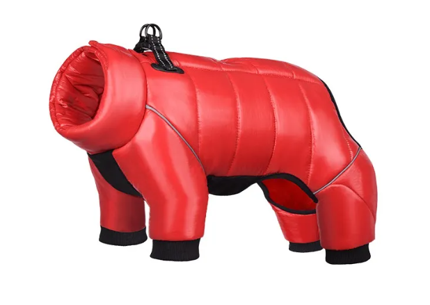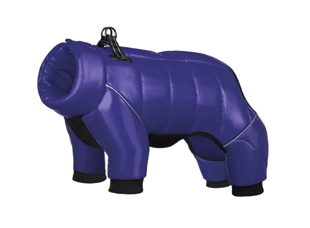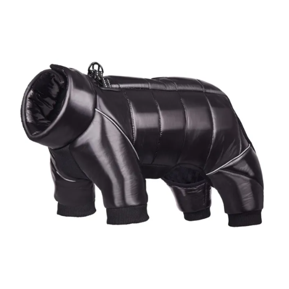 O design cobre o corpo e as patas, garantindo isolamento térmico completo e liberdade de movimentos. O interior é forrado com tecido macio, proporcionando conforto adicional. O fecho superior em zíper facilita a colocação e remoção, e as argolas resistentes integradas permitem prender a trela de forma segura, dispensando o uso de arnês.