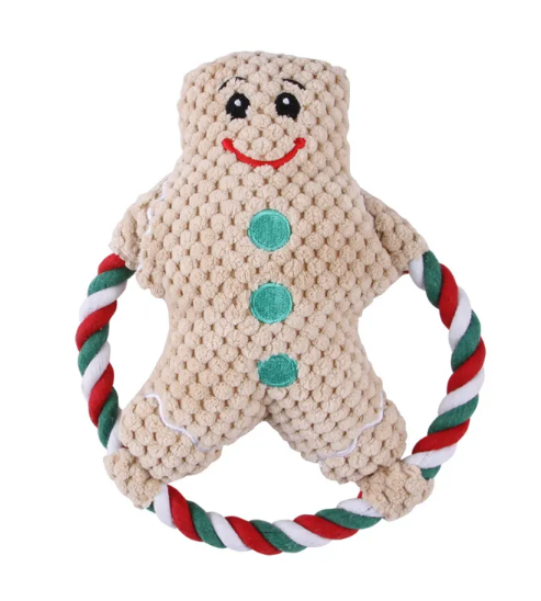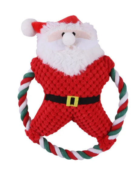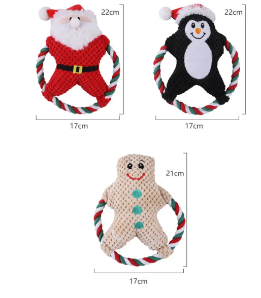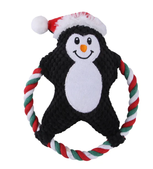 Brinquedo de Natal de corda para cães. Ideal para momentos de diversão, interação e exercício, este brinquedo combina o espírito natalício com a resistência necessária para as brincadeiras do teu patudo. Feito em algodão trançado durável, ajuda a manter os dentes e gengivas saudáveis enquanto satisfaz o instinto natural de morder e puxar. Disponível em três personagens festivas — Pai Natal, Pinguim e Boneco de Gengibre — é perfeito para jogos de força, lançamento ou simplesmente para o cão transportar com orgulho pela casa. Um brinquedo seguro, divertido e cheio de charme para animar o Natal do teu melhor amigo.