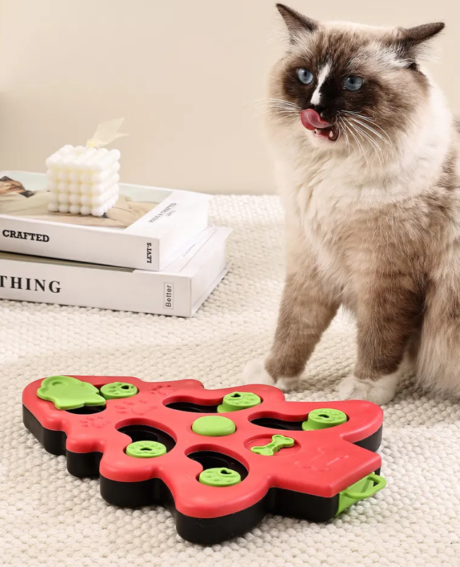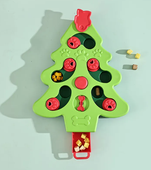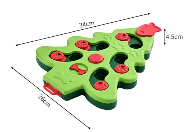 Brinquedo interativo de Natal em forma de árvore para cães. Um jogo divertido e educativo que estimula a mente do teu patudo enquanto o entretém durante horas. Basta esconder pequenas recompensas nas aberturas e deixar que o cão use o faro e a inteligência para as descobrir. Ajuda a reduzir o tédio, a ansiedade e promove uma alimentação mais lenta e saudável. Fabricado em plástico resistente e seguro, é fácil de limpar e ideal para uso diário. O design em forma de árvore de Natal e as cores festivas tornam este brinquedo perfeito para a época natalícia. Indicado para cães de todas as idades e tamanhos. Um presente criativo que combina diversão, desafio e espírito de Natal.